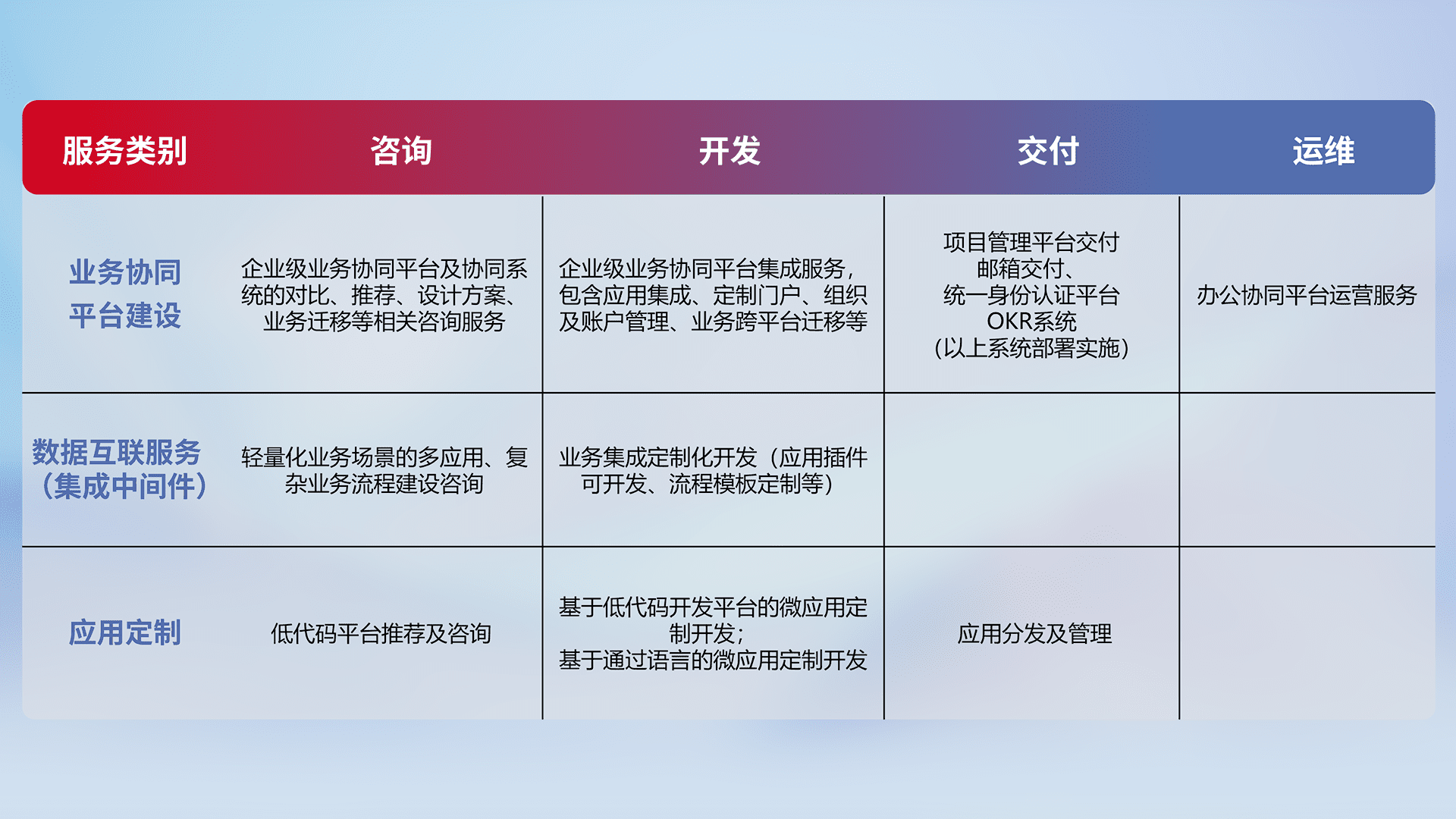 针对钉钉、、企微、、、、IDaas等平台级产品提供产品的规划、、方案、、交付、、、、定制化开发等服务,,,,实现如统一协同办公、、、、智能客户服务、、、混合会议管理、、、、智能数据查询、、、、等业务场景,,,,实现数字化转型。。。